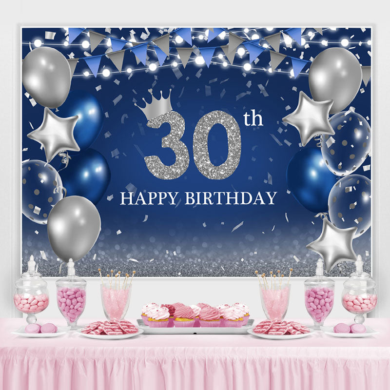 Ballon à paillettes argentées et toile de fond bleue du 30e anniversaire