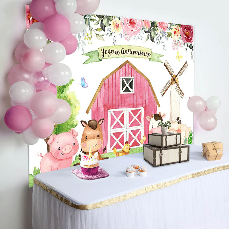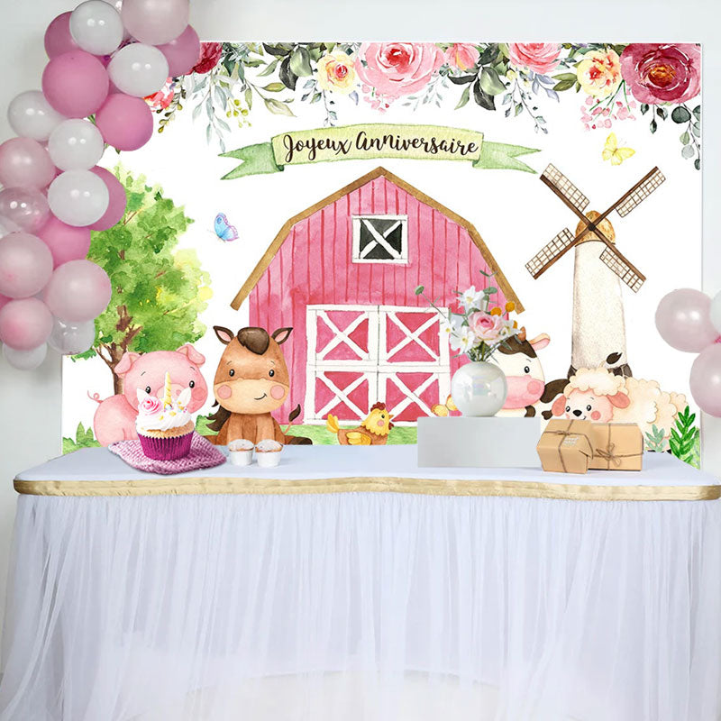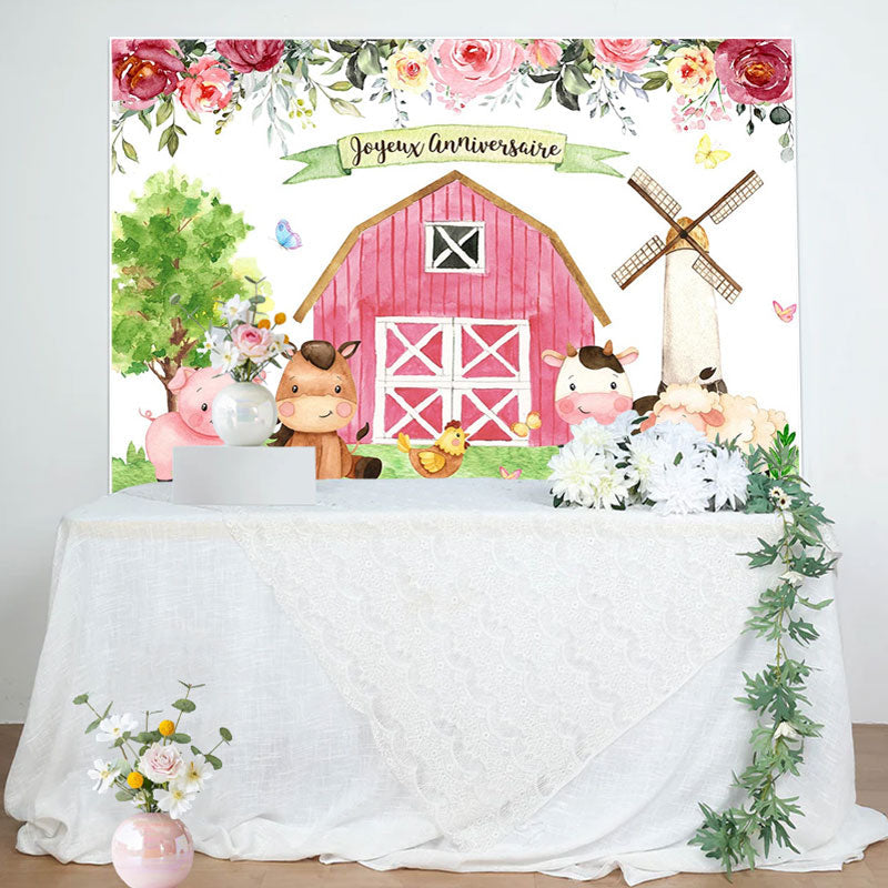 Floral Ferme Avec Mignon Animaux Heureux Anniversaire Toile de fond
