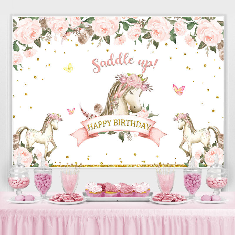 Happy Birthday Saddle Up Horse Toile de fond sur le th¨¨me de la fleur rose
