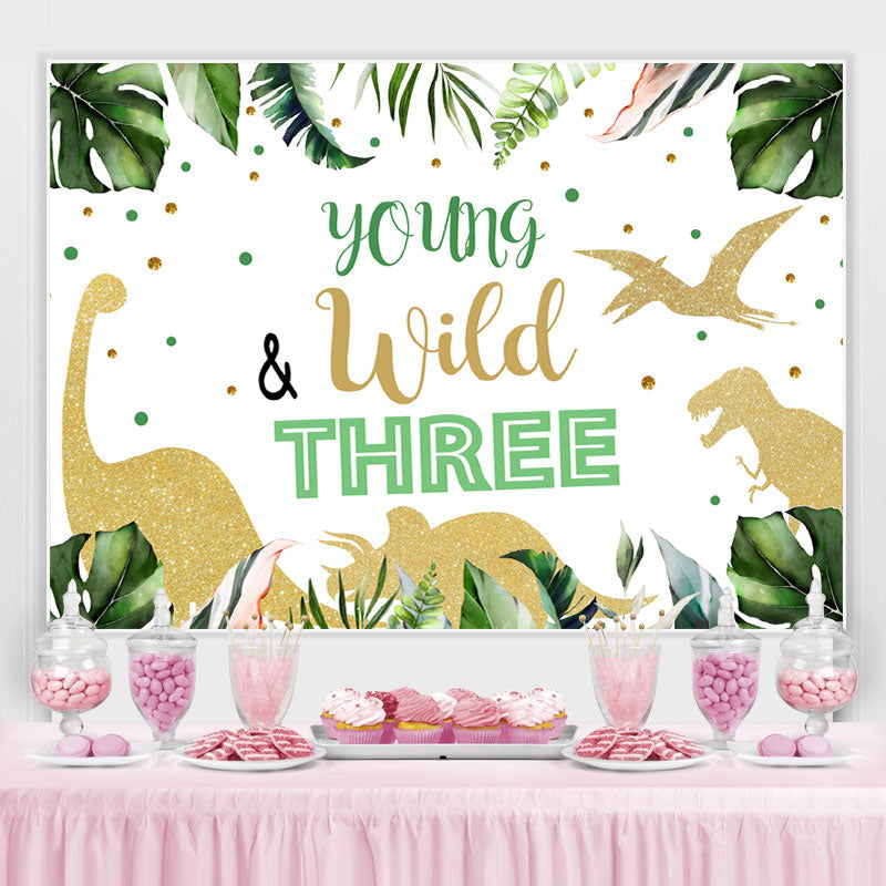 Jeune toile de fond verte de trois dinosaures sauvages pour l'anniversaire