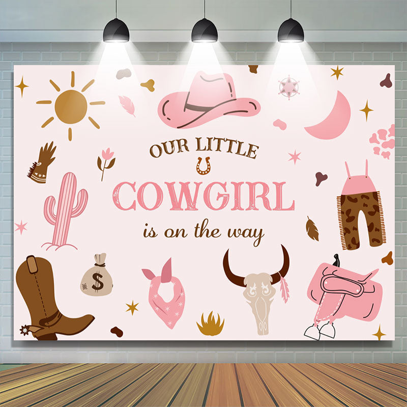 La petite cow-girl est sur le chemin de la toile de fond de douche de bébé rose