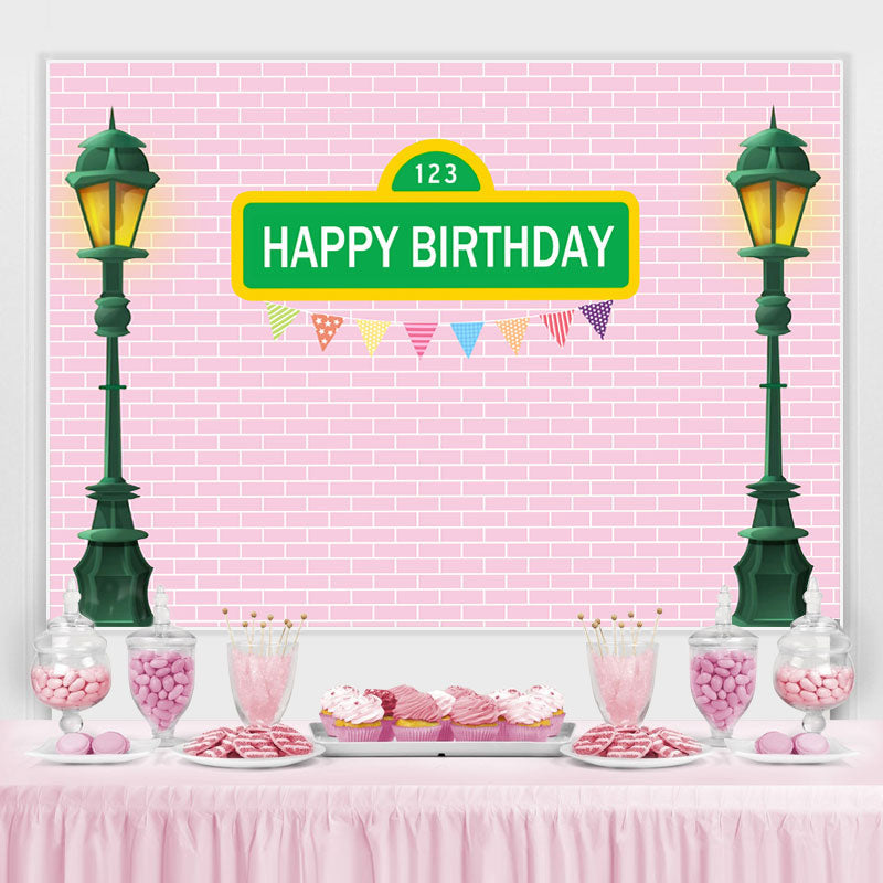 Lampadaire vert avec toile de fond d'anniversaire en brique rose