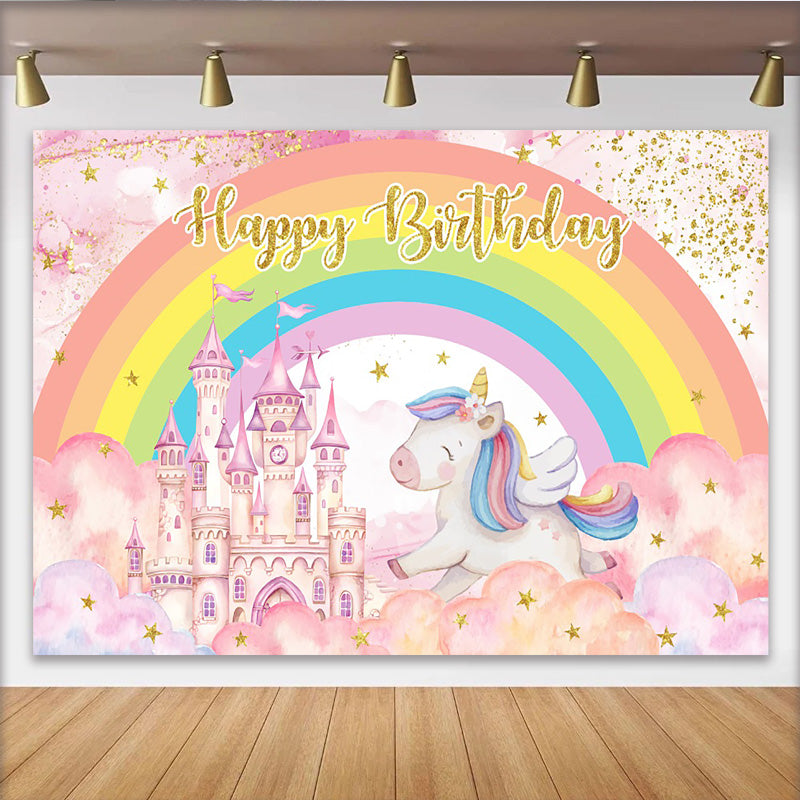 Lofaris Toile de Fond Château de Princesse Licorne Rose, Royaume Magique Arc-en-ciel et Étoiles Or