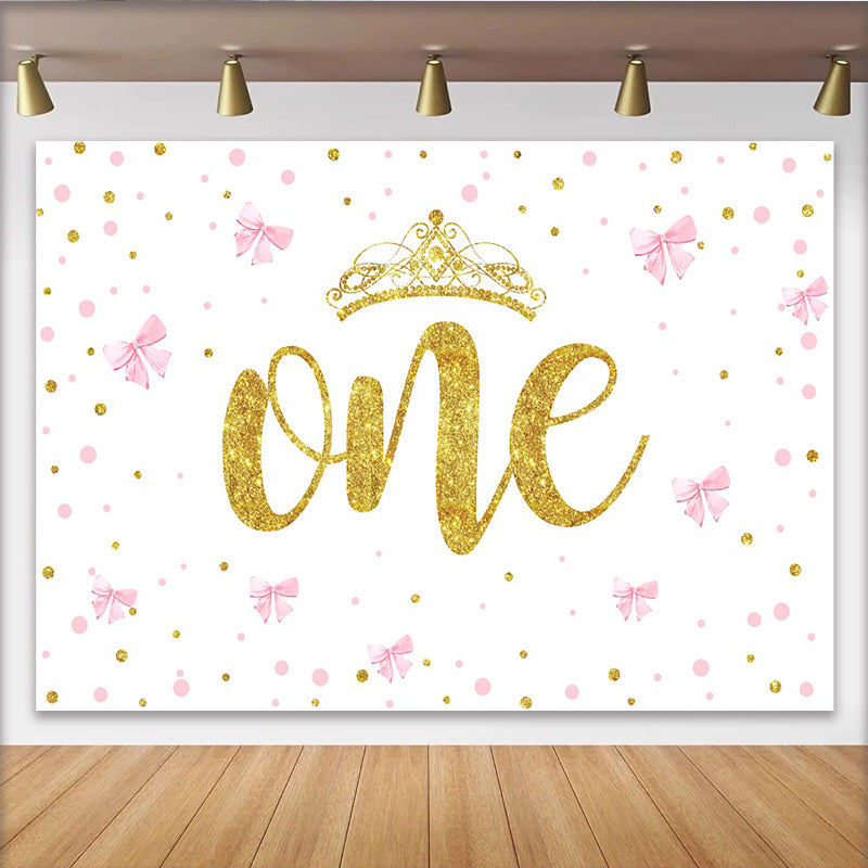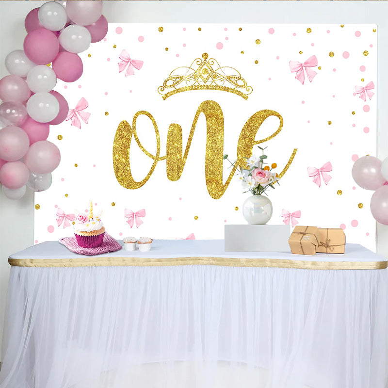 Lofaris Toile de Fond Premier Anniversaire Nœuds Roses et Couronne Or, Arrière-plan ONE Fille