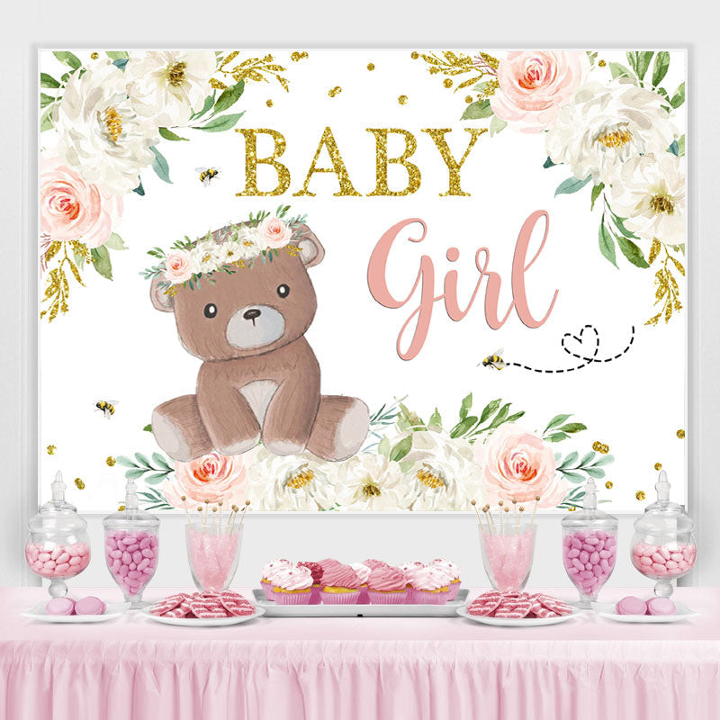 Ours en peluche bébé fille et toile de fond florale pour baby shower
