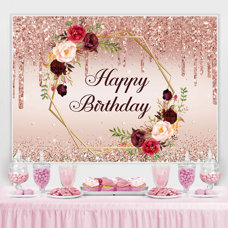 Paillettes roses et toile de fond de fête joyeux anniversaire floral