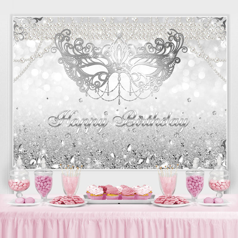 Toile de fond d'anniversaire de masque de bokeh de diamants de paillettes d'argent