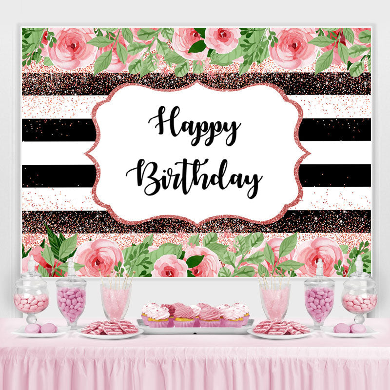Toile de fond d'anniversaire de paillettes de feuilles vertes et florales roses