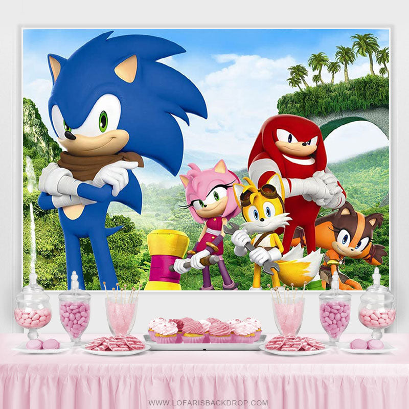 Toile de fond d'anniversaire de paysage de montagne de palmier de personnage de dessin animé