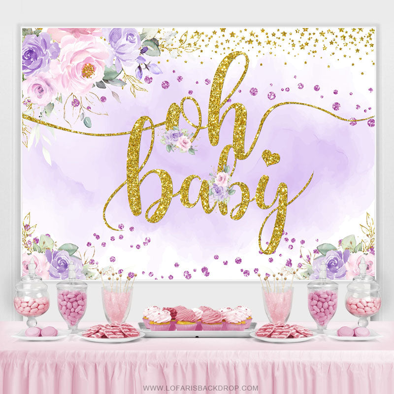 Toile de fond de douche de bébé floral violet et doré scintillant