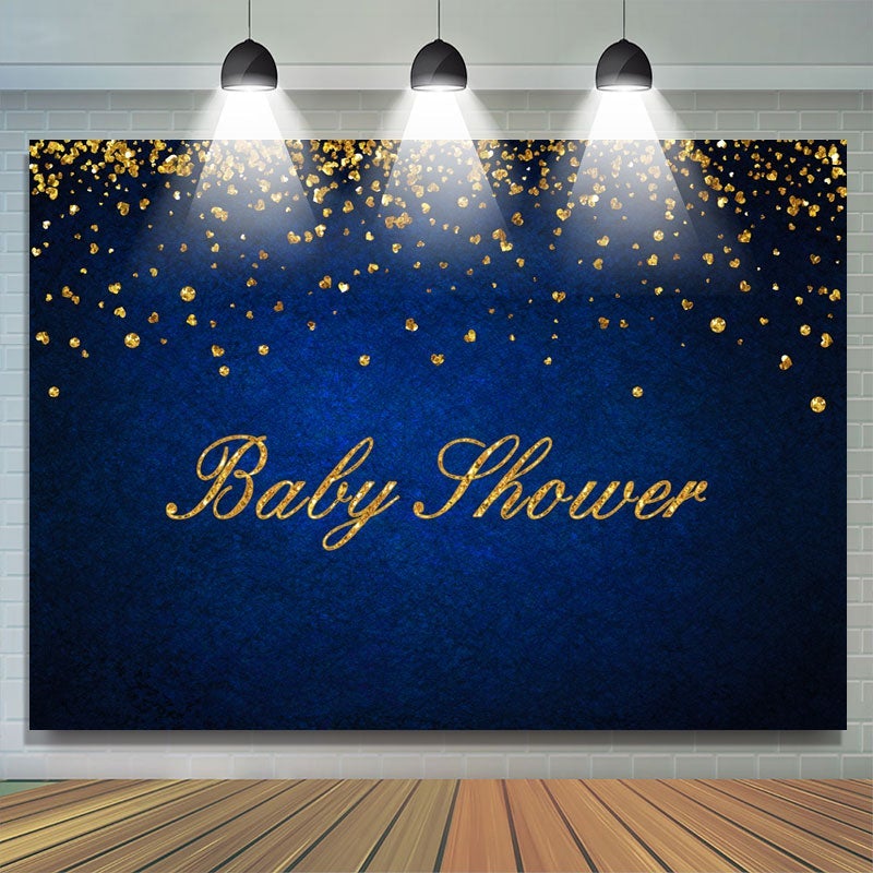 Toile de fond de fête de douche de bébé bleu foncé et bokeh doré