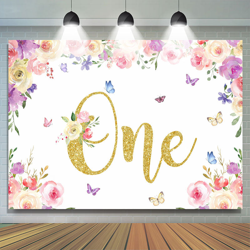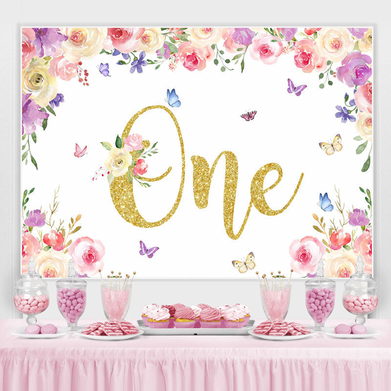 Toile de fond d'un anniversaire à paillettes florales et papillons