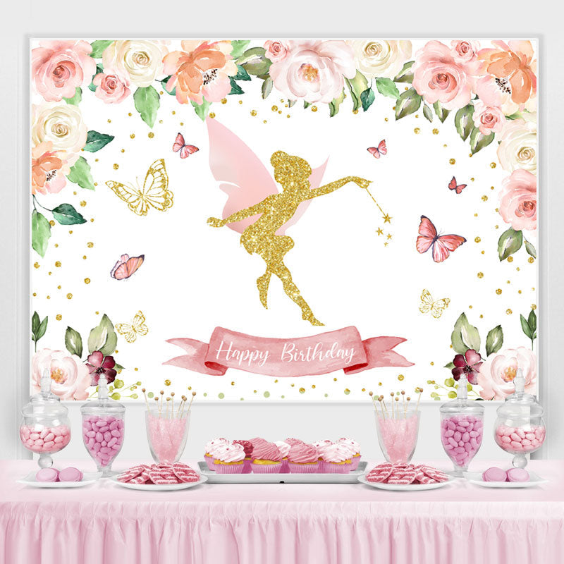 Toile de fond joyeux anniversaire fée papillon floral rose