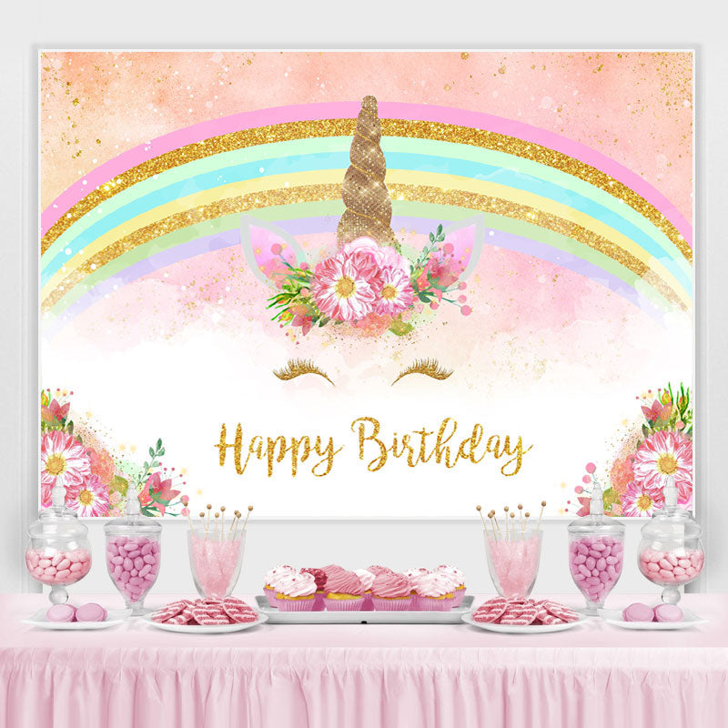 Toile de fond joyeux anniversaire Licorne scintillante et florale
